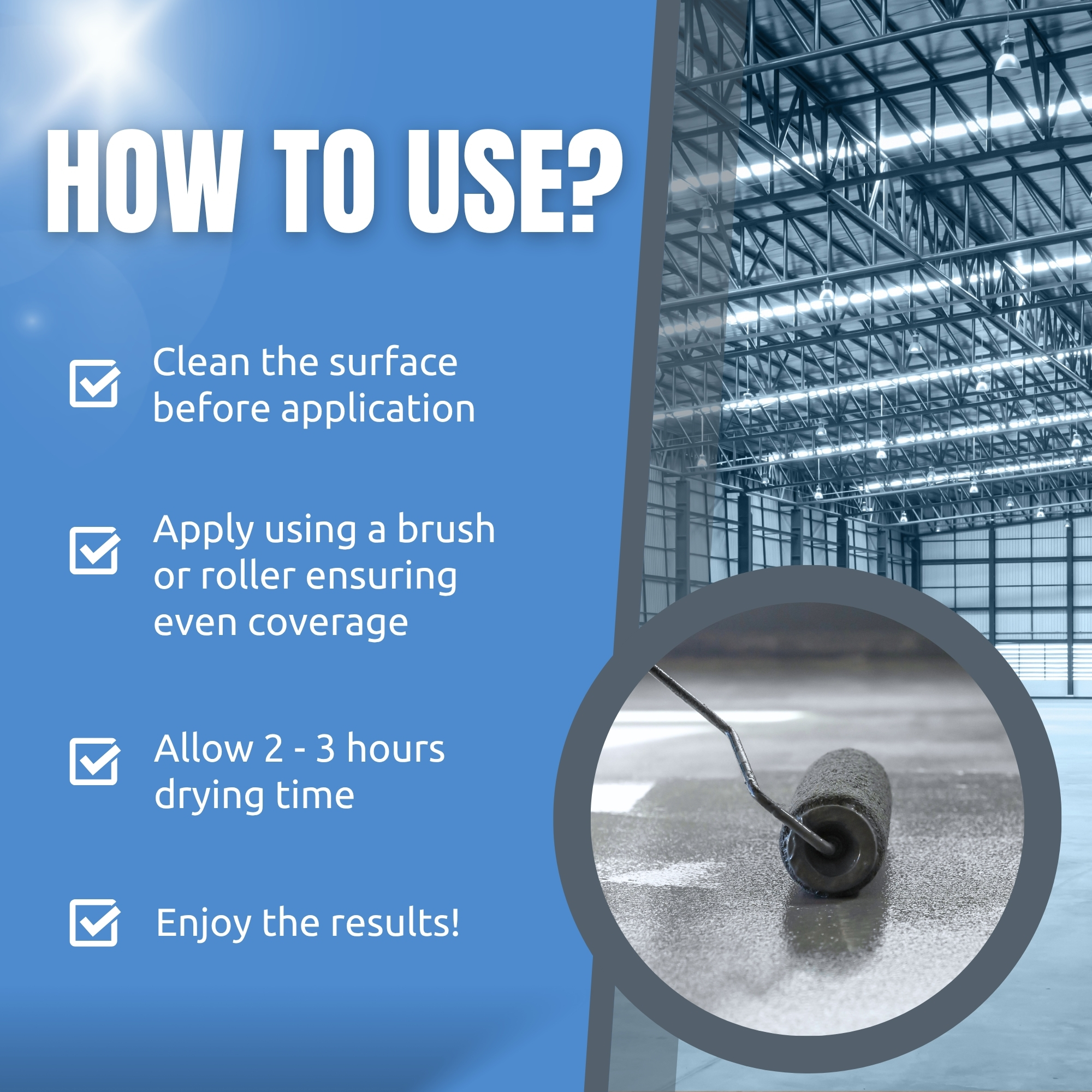 Prior to application, the surface should be clean, dry, stable, dust free, with no dirt, grease and oil present. Any old paint coating previously applied should be removed completely before applying. If the floor is power-floated or has an existing coating please call our technical team on 01268 722500 for advice before starting.