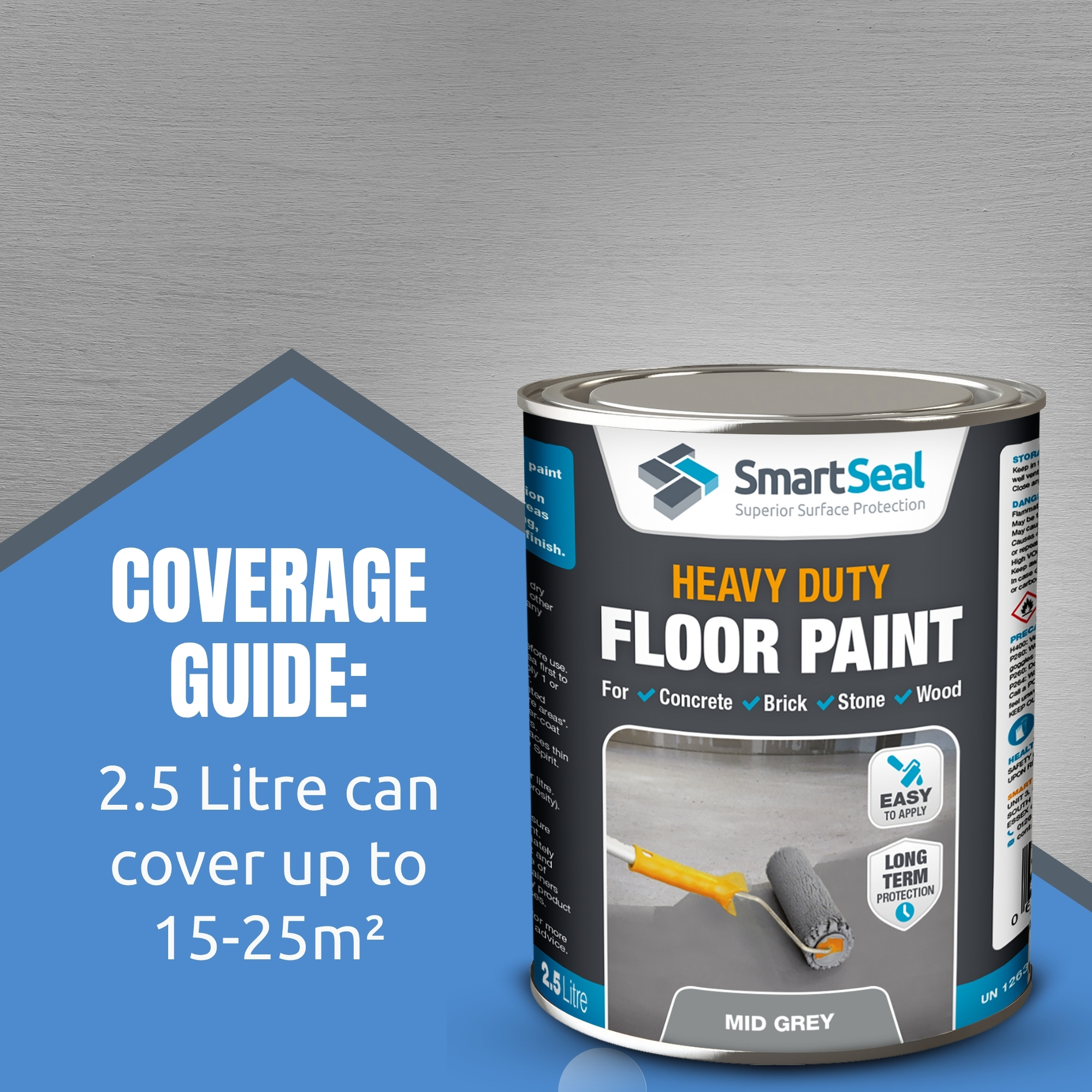 Smartseal Heavy Duty Floor Paint is formulated using a special blend of high quality thermo-acrylic and polyurethane resins. This creates a hard wearing, heavy duty elastomeric coating or paint for lasting protection to many high-trafficked areas in the residential and commercial sector. Often used as a deck paint and garage floor paint, the Heavy Duty Floor Paint provides a tough, durable, long lasting protective coating that also has an anti-slip finish. However, although the floor paint will help, it is not possible to guarantee a totally non-slip surface after application