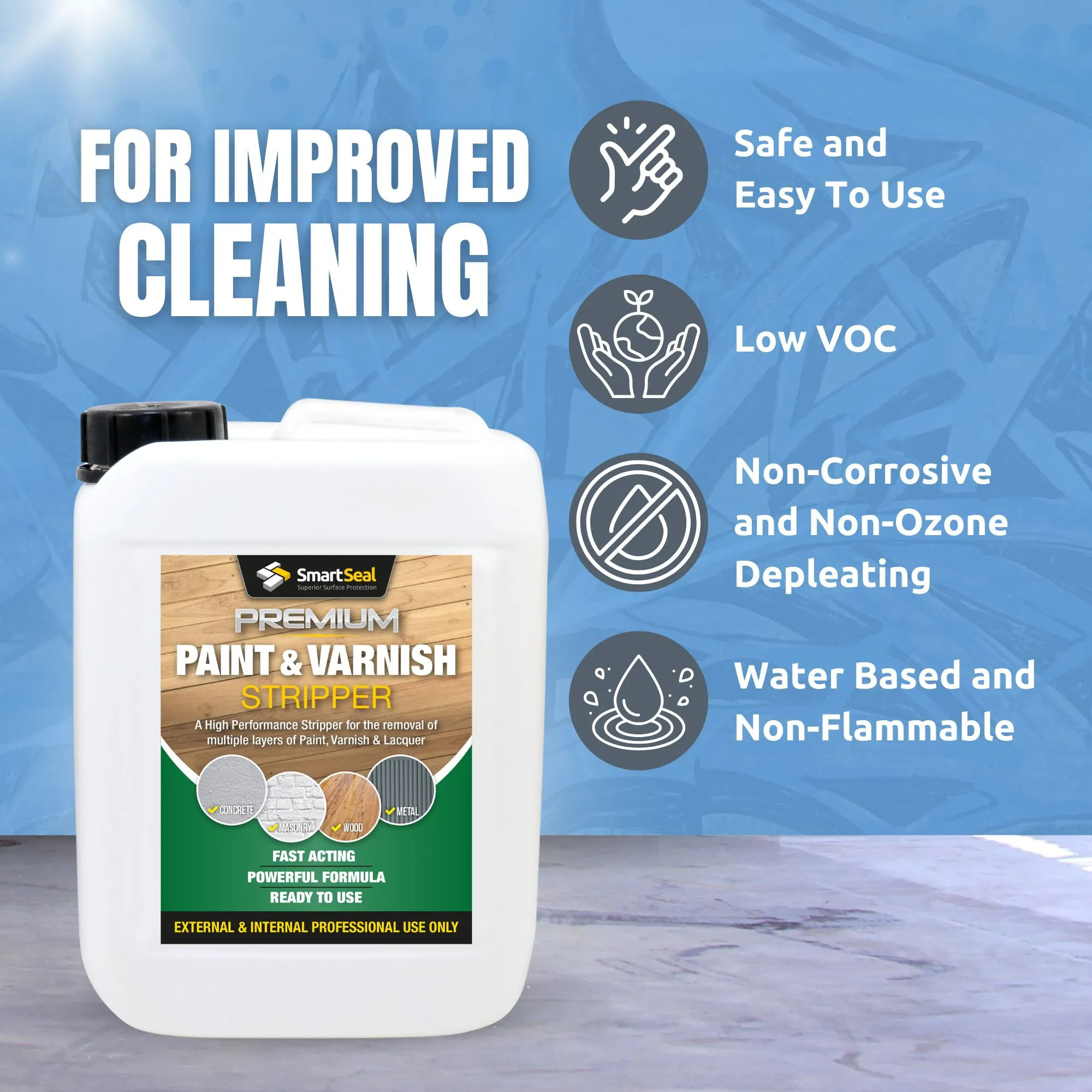 Smartseal's Premium Paint & Varnish Stripper is a High Performance Paint Stripper for the removal of multiple layers of Paint, Varnish & Lacquer. The Heavy Duty Paint & Varnish Stripper is suited for both internal & external use, removing the above finishes from Concrete, Masonry, Brick, Metal & Wood.