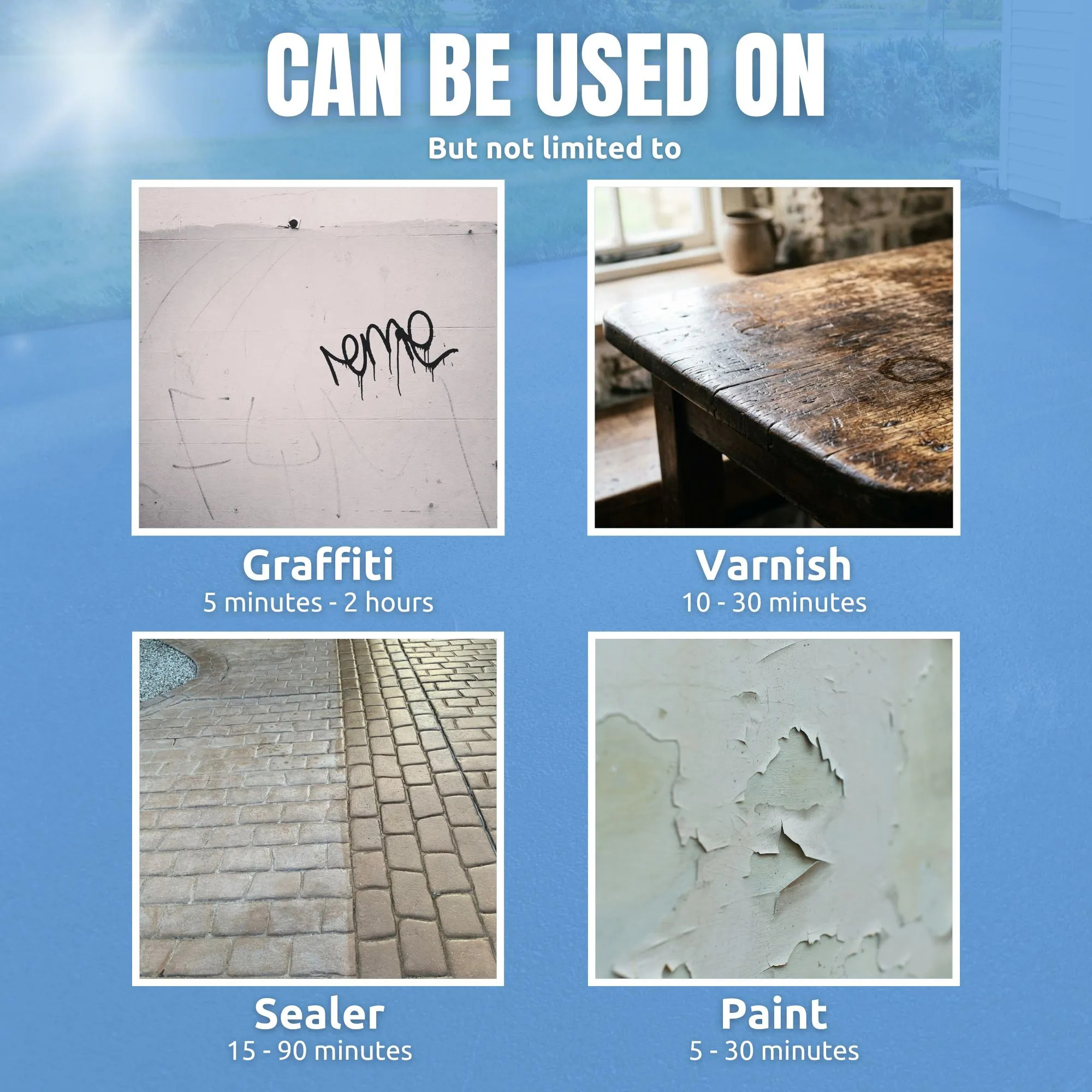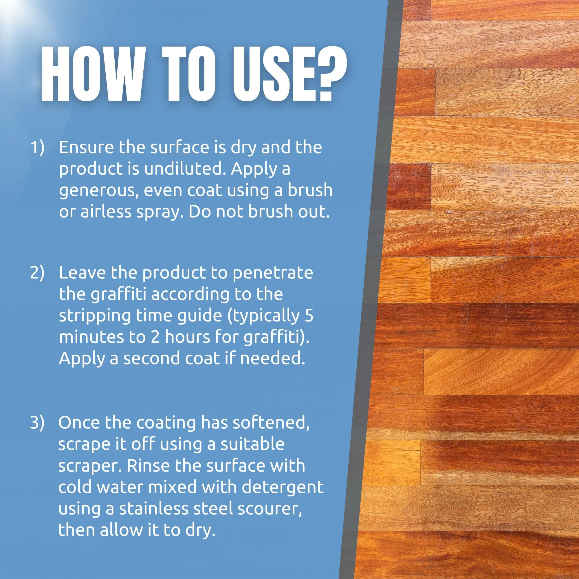 Ready to use and should not be diluted. Ensure the surface is completely dry before application. Cover container lid with a cloth during opening to avoid splashes. Layer a generous, even coat onto the surface using a clean brush or airless spray (rollers can be used for light coatings) DO NOT BRUSH OUT Leave for the recommended timing dependant on the stripping guide and apply a second generous coat. (On less than five layers of Paint or Varnish, a second coat may not be necessary). After the product has penetrated the substrate (up to 24 hours) scrape off with suitable scrapers, leaving surface as clean as possible. Rinse clean with cold water containing detergent and a stainless steel scourer, leave to dry. Never use steel wool, stainless steel only.